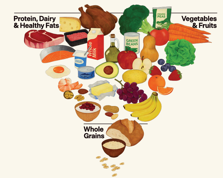 與十多年前被「我的餐盤」取代的舊金字塔不同 ,新金字塔將最應該攝取的食物放在平坦的頂部:來自動物和植物來源的營養豐富的蛋白質;來自雞蛋、海鮮、肉類、全脂乳製品、堅果、種子、橄欖和酪梨等全食物的健康脂肪;以及蔬菜和水果。